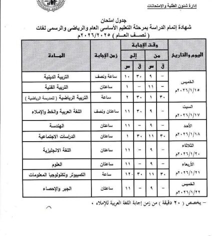 جدول امتحانات الشهادة الإعدادية للفصل الدراسي الأول 2026 في القليوبية